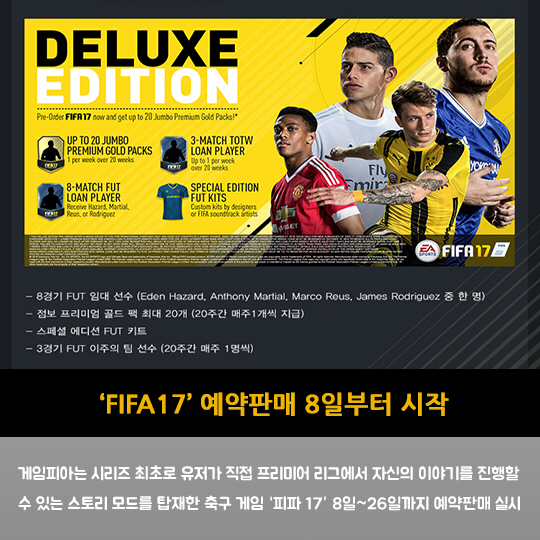 게임피아는 시리즈 최초로 유저가 직접 프리미어 리그에서 자신의 이야기를 진행할 수 있는 스토리 모드를 탑재한 축구 게임 '피파 17' 8일~26일까지 예약판매 실시
