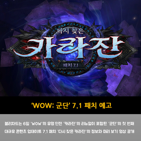 블리자드는 6일 'WOW'의 유명 던전 '카라잔'의 리뉴얼이 포함된 '군단'의 첫 번째 대규모 콘텐츠 업데이트 7.1 패치 '다시 찾은 카라잔'의 정보와 미리 보기 영상 공개