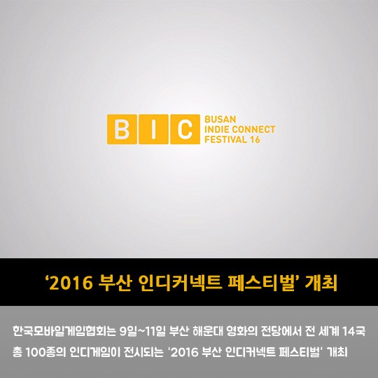 한국모바일게임협회는 9일~11일 부산 해운대 영화의 전당에서 전 세계 14국 총 100종의 인디게임이 전시되는 '2016 부산 인디커넥트 페스티벌' 개최