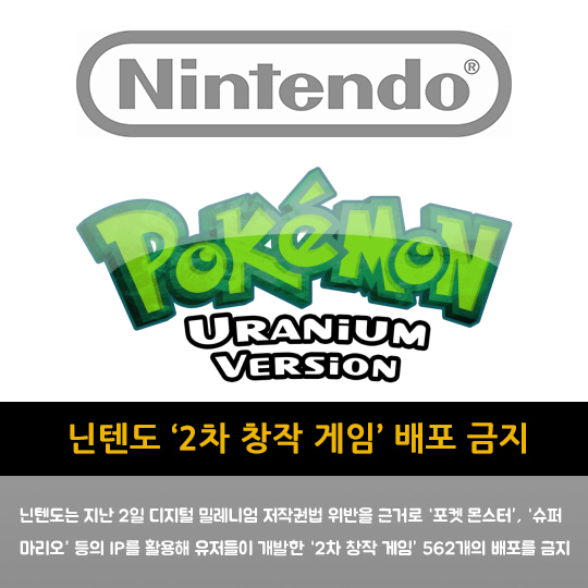 닌텐도는 지난 2일 디지털 밀레니엄 저작권법 위반을 근거로 '포켓 몬스터', '슈퍼 마리오' 등의 IP를 활용해 유저들이 개발한 '2차 창작 게임' 562개의 배포를 금지