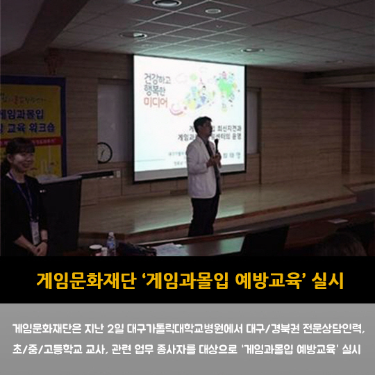 게임문화재단은 지난 2일 대구가톨릭대학교병원에서 대구/경북권 전문상담인력, 초/중/고등학교 교사, 관련 업무 종사자를 대상으로 '게임과몰입 예방교육' 실시