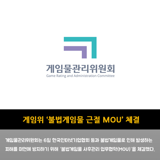 게임물관리위원회는 6일 한국인터넷기업협회 등과 불법게임물로 인해 발생하는 피해를 미연에 방지하기 위해 '불법게임물 사후관리 업무협약(MOU)'을 체결했다.