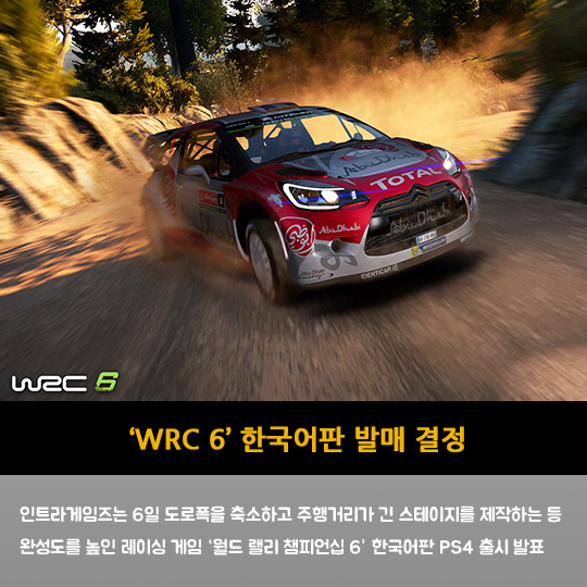 인트라게임즈는 6일 도로폭을 축소하고 주행거리가 긴 스테이지를 제작하는 등 완성도를 높인 레이싱 게임 '월드 랠리 챔피언십 6' 한국어판 PS4 출시 발표