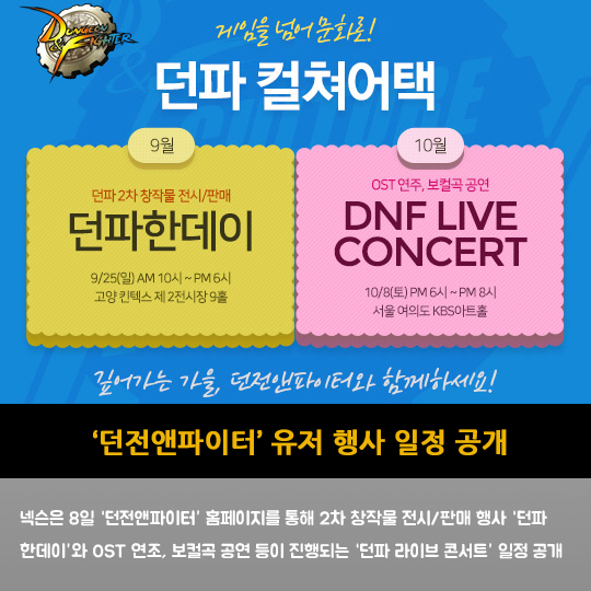 넥슨은 8일 '던전앤파이터' 홈페이지를 통해 2차 창작물 전시/판매 행사 '던파한데이'와 OST 연조, 보컬곡 공연 등이 진행되는 '던파 라이브 콘서트' 일정 공개