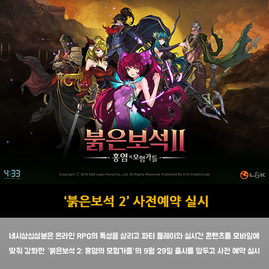 네시삼십삼분은 온라인 RPG의 특성을 살리고 파티 플레이와 실시간 콘텐츠를 모바일에 맞춰 강화한 '붉은보석 2: 홍염의 모험가들'의 9월 29일 출시를 앞두고 사전 예약 실시