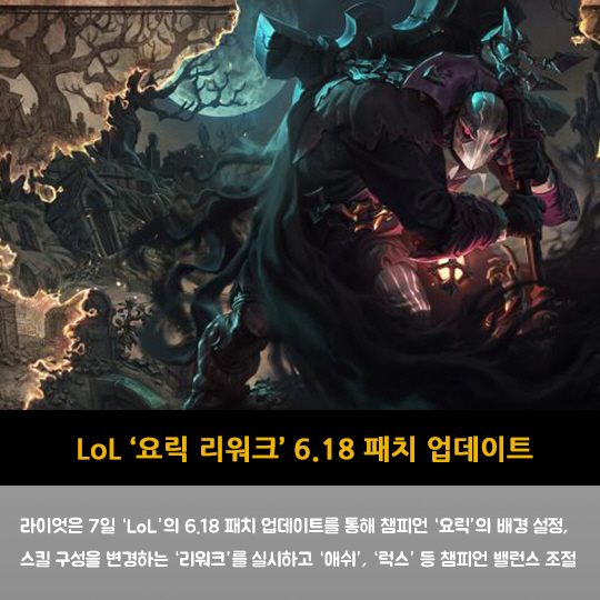 라이엇은 7일 'LoL'의 6.18 패치 업데이트를 통해 챔피언 '요릭'의 배경 설정, 스킬 구성을 변경하는 '리워크'를 실시하고 '애쉬', '럭스' 등 챔피언 밸런스 조절