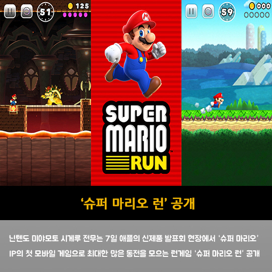 닌텐도 미야모토 시게루 전무는 7일 애플의 신제품 발표회 현장에서 '슈퍼 마리오' IP의 첫 모바일 게임으로 최대한 많은 동전을 모으는 런게임 '슈퍼 마리오 런' 공개