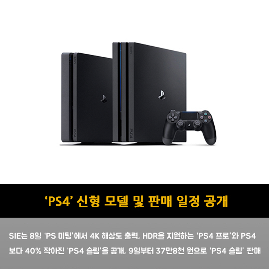 SIE는 8일 'PS 미팅'에서 4K 해상도 출력, HDR을 지원하는 'PS4 프로'를 공개, PS4와 같은 성능이지만 작아진 'PS4 슬림'을 9일부터 37만8천 원으로 판매 발표