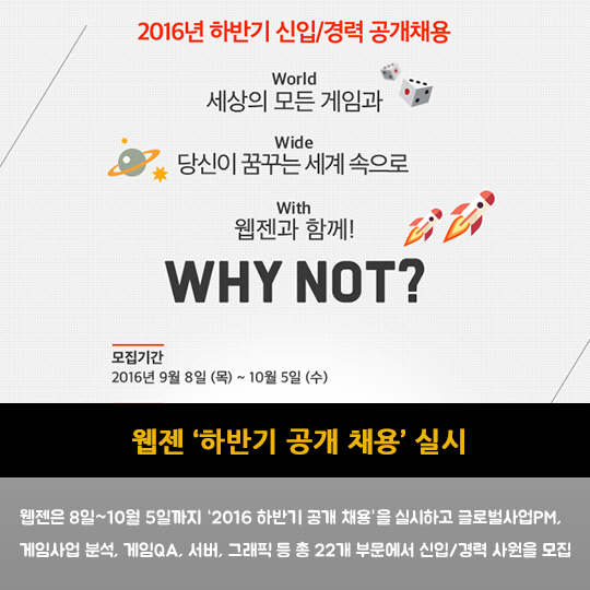 웹젠은 8일~10월 5일까지 '2016 하반기 공개 채용'을 실시하고 글로벌사업PM, 게임사업 분석, 게임QA, 서버, 그래픽 등 총 22개 부문에서 신입/경력 사원을 모집