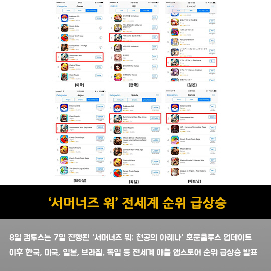 8일 컴투스는 7일 진행된 '서머너즈 워: 천공의 아레나' 호문쿨루스 업데이트 이후 한국, 미국, 일본, 브라질, 독일 등 전세계 애플 앱스토어 순위 급상승 발표