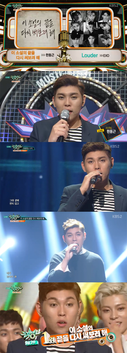 9일 방송한 KBS2 '뮤직뱅크'에서는 한동근 '이 소설의 끝을 다시 써보려해'와 엑소 '라우더'가 1위 후보에 올라 각축전을 펼쳤다.