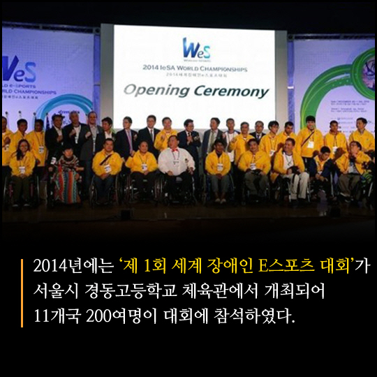 2014년에는 '제1회 세계 장애인 E스포츠 대회'가 서울시 경동고등학교 체육관에서 개최되어 11개국 200여명이 대회에 참석하였다.