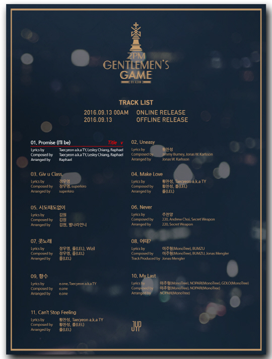 2PM은 오늘(10일) 0시 JYP엔터테인먼트 공식 SNS를 통해 새 정규앨범 'GENTLEMEN'S GAME' 트랙리스트를 공개했다.