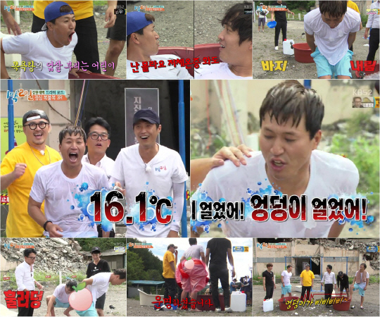 [스포츠조선닷컴 정안지 기자]'1박 2일' 김종민이 '냉동 엉덩이'로 시원한 웃음을 선사했다. 그가 점심 복불복 '체온 떨어뜨리기'에서 멤버들에게 인정사정없는 엉덩이 얼음찜질을 당한 뒤 엉덩이 온도 측정에서 16.1도라는 엄청난 기록을 세운 것.