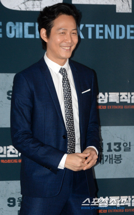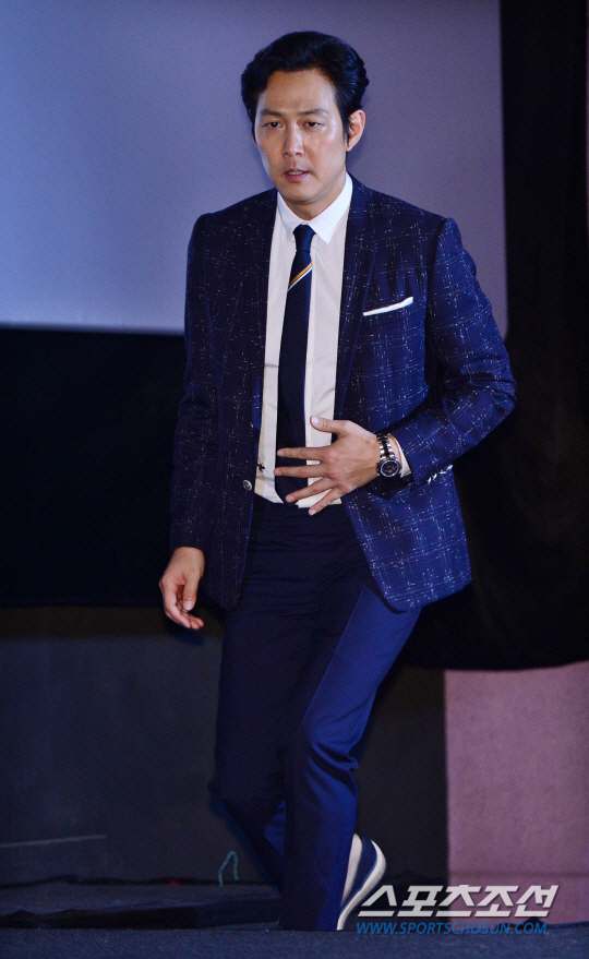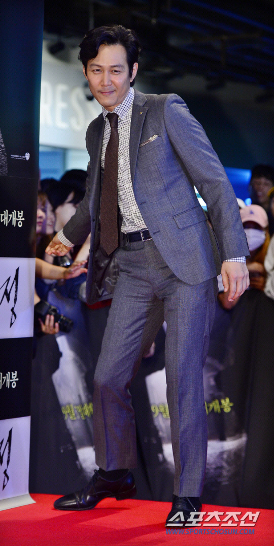 이정재의 가장 최근 수트 스타일은 9일 영화 '인천상륙작전' 확장판 언론시사회에서 볼 수 있다. 이정재는 흔히 볼 수 있는 네이비 컬러 수트에 화이트 셔츠를 매치해 베이직한 스타일을 연출했다. 거기에 패턴이 들어간 타이, 행커치프를 더해 디테일에도 신경쓴 모습을 보여주었다.