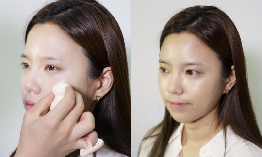 내추럴 메이크업이지만 피부 톤을 한 톤 정도 높인 베이스 제품을 선택해 밝은 피부톤을 유지하자. 스펀지로 촉촉하게 마무리 한 후, 입자가 고운 파우더로 얼굴 윤곽을 쓸어 주면 깔끔하게 표현이 가능하다.