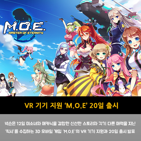 넥슨은 12일 미소녀와 메카닉을 결합한 신선한 스토리와 각기 다른 매력을 지닌 '픽시'를 수집하는 3D 모바일 게임 'M.O.E'의 VR 기기 지원과 20일 출시 발표