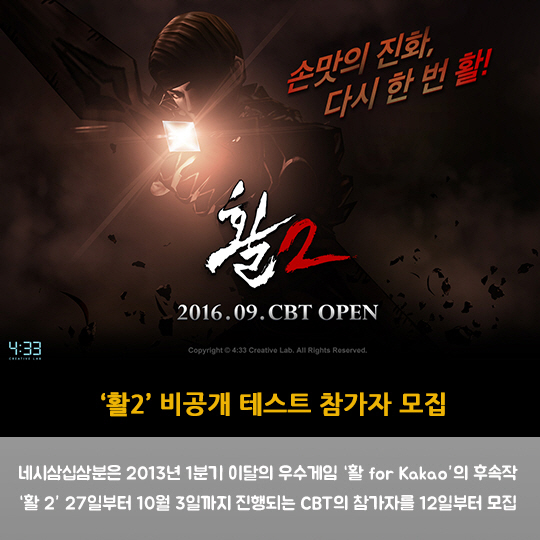 네시삼십삼분은 2013년 1분기 이달의 우수게임 '활 for Kakao'의 후속작 '활 2' 27일부터 10월 3일까지 진행되는 CBT의 참가자를 12일부터 모집