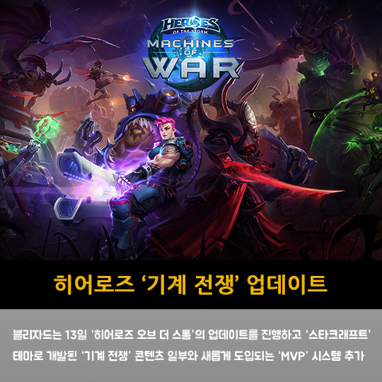 블리자드는 13일 '히어로즈 오브 더 스톰'의 업데이트를 진행하고 '스타크래프트' 테마로 개발된 '기계 전쟁' 콘텐츠 일부와 새롭게 도입되는 'MVP' 시스템 추가