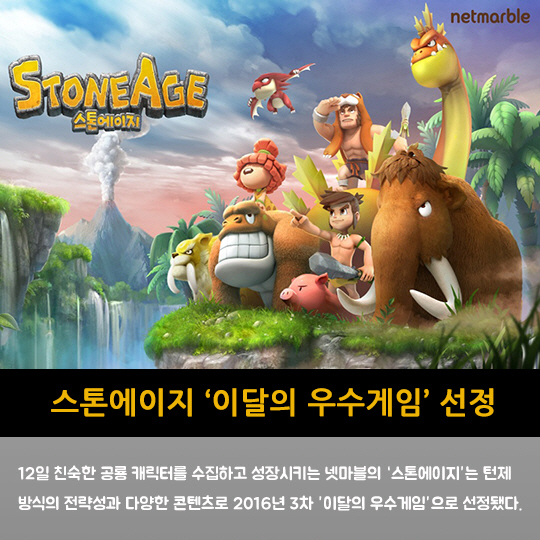 12일 친숙한 공룡 캐릭터를 수집하고 성장시키는 넷마블의 '스톤에이지'는 턴제 방식의 전략성과 다양한 콘텐츠로 2016년 3차 '이달의 우수게임'으로 선정됐다.
