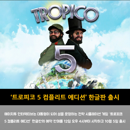 에이치투 인터렉티브는 대통령이 되어 섬을 운영하는 전략 시뮬레이션 게임 '트로피코 5 컴플리트 에디션' 한글판의 예약 판매를 12일 오후 4시부터 시작하고 10월 5일 출시