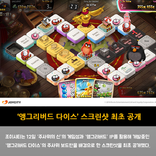 조이시티는 12일 '주사위의 신'의 게임성과 '앵그리버드' IP를 활용해 개발중인 '앵그리버드 다이스'의 주사위 보드판을 배경으로 한 스크린샷을 최초 공개했다.