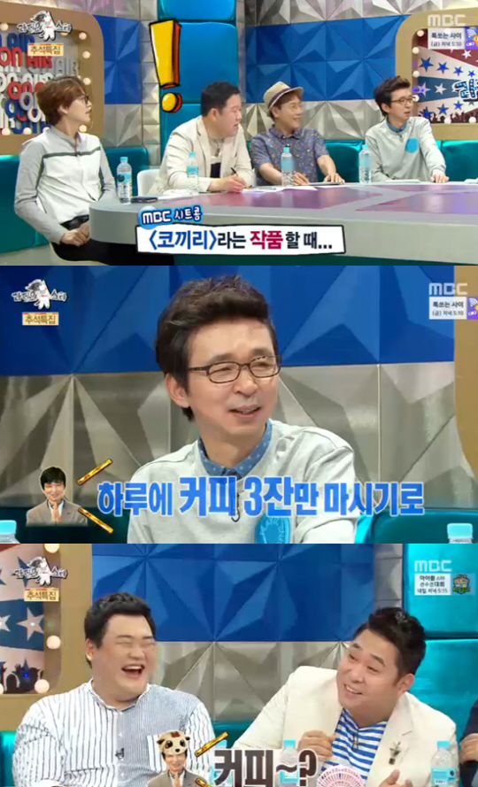 그러면서 문세윤은 "형님이 매니저가 오나 보면서 몰래 커피를 마시더라"며 "한번은 미어캣 처럼 홀짝 조금마시고 숨기시더라"고 설명해 웃음을 안겼다.