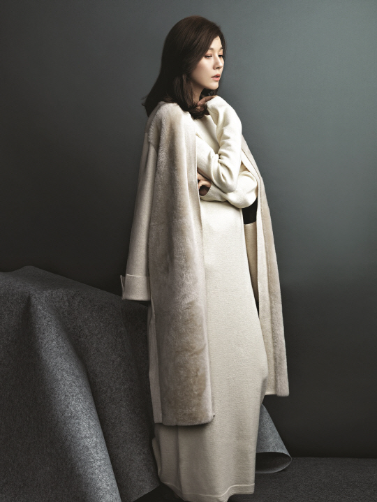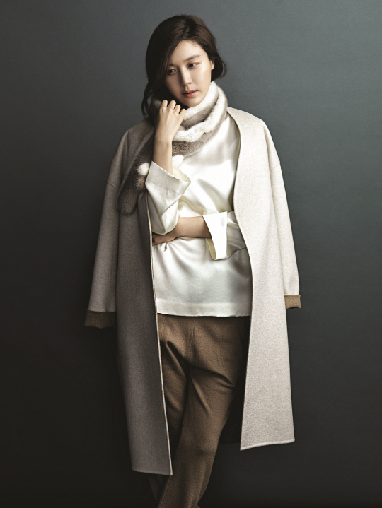 김하늘 청순 스타일링의 키 포인트는 그윽하게 화사한 베이지 컬러다. 부드러운 촉감이 도드라지는 가을·겨울 소재의 텍스처를 더욱 잘 보일 수 있는 색상이기도 하며, 깔끔하고 여성스러운 인상을 주기에 좋다. 김하늘은 트렌디한 롱앤린(long&lean) 실루엣에 올 베이지 아이템을 선택한 모습이 돋보인다. 특히 무스탕과 캐시미어의 소재 믹스는 자칫 지루해질 수 있는 원 컬러 스타일링을 다채롭게 만든 요소가 되었다.