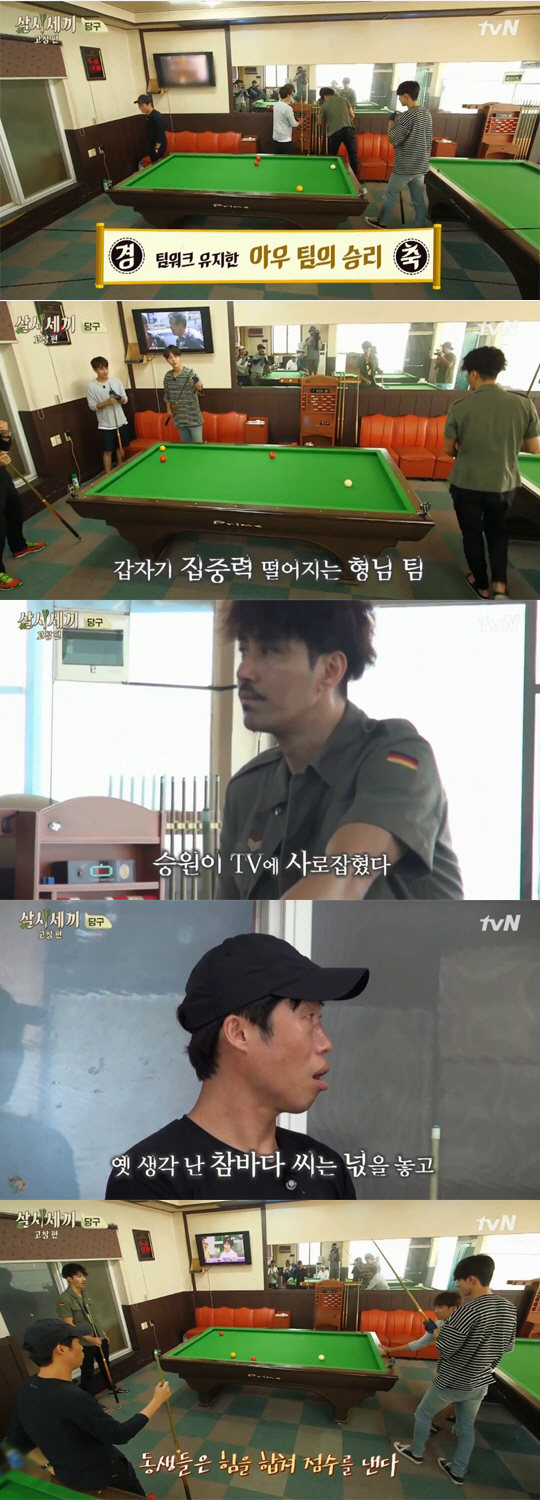 16일 tvN '삼시세끼'에서는 형님팀과 동생팀으로 나뉜 당구 승부가 방송됐다.
