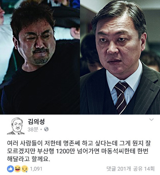 이후 '부산행'이 관객수 1200만을 눈앞에 두자 김의성은 "진지하게 말씀드립니다. '부산행' 관람을 멈춰주세요. 반복합니다. 관람을 멈춰주세요"라며 호소했다. 다행히도(?) 그의 초조함이 전해진 듯 '부산행' 누적 관객은 1155만 명으로 아름답게 마무리됐다.