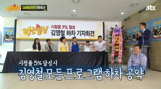 김영철은 지난해 JTBC '아는 형님' 첫 방송 하루 전날 V앱에서 멤버들과 함께 시청률 관련 공약에 대해 이야기를 나누던 중 "3%가 넘을 시 프로그램에서 하차하라"는 압박을 받았다. 웃음으로 넘겼던 '시청률 3% 달성시 하차'는 현실로 나타났다. '아는 형님'은 마침내 지난 7월 시청률 3%를 돌파했고, 김영철은 한창 인기 있는 프로그램에서 아무런 물의도 일으키지 않고 하차하는 최초의 연예인이 됐다.