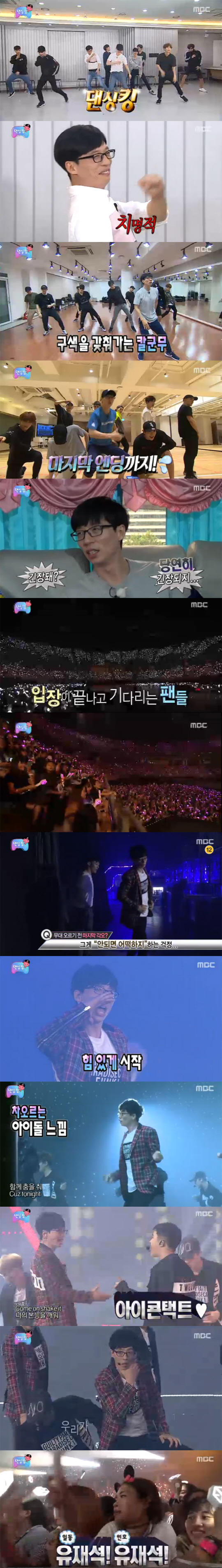 드디어 한 번밖에 없는 최종 무대. 먼저 무대에 오른 엑소 선배들의 무대를 경건하게 지켜본 유재석은 무대에 오르기 직전까지 떨리는 심장을 부여잡고 무대에 올랐다.
