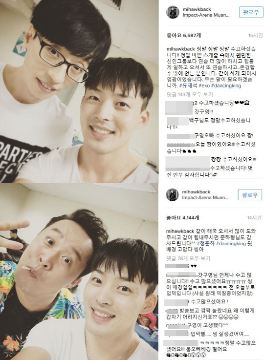 SM엔터테인먼트의 안무디렉터로 엑소와 유재석의 콜라보레이션 무대를 뒤에서 이끈 백구영은 17일 자신의 인스타그램에 공연 현장에서 유재석과 함께 찍은 사진을 올렸다. '정말 정말 정말 수고하셨습니다! 정말 바쁜 스케줄 속에서 웬만한 신인그룹보다 연습 더 많이 하시고 힘들게 일하고 오셔서 또 연습하시고…. 존경할 수 밖에 없는 분입니다'라고 썼다. "같이 하게 되어서 영광이었습니다. 무슨 말이 필요하겠습니까"라며 '엑소 막내' 유재석의 무한열정에 찬사를 보냈다.