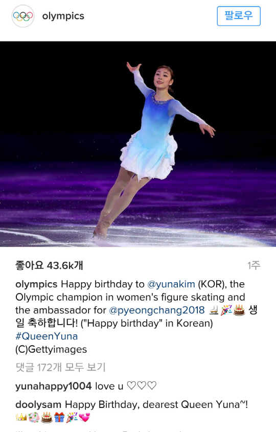 이어 공식인스타그램에도 김연아의 생일을 축하하는 메세지를 남겼다. IOC는 "한국의 유나킴의 생일을 축하합니다. 여자 피겨 올림픽 챔피언이자 2018 평창올림픽의 홍보대사인 퀸의 생일을 축하합니다"라면서 한글로 '생일 축하합니다' 메세지를 남겨 김연아를 향한 뜨거운 사랑을 드러냈다. 보통 선수들의 경기 결과 기록 등을 전하는 공식 SNS에 선수 개인의 생일이나 2세 탄생을 알린 경우는 김연아와 펠프스 정도의 선수가 유일하다.