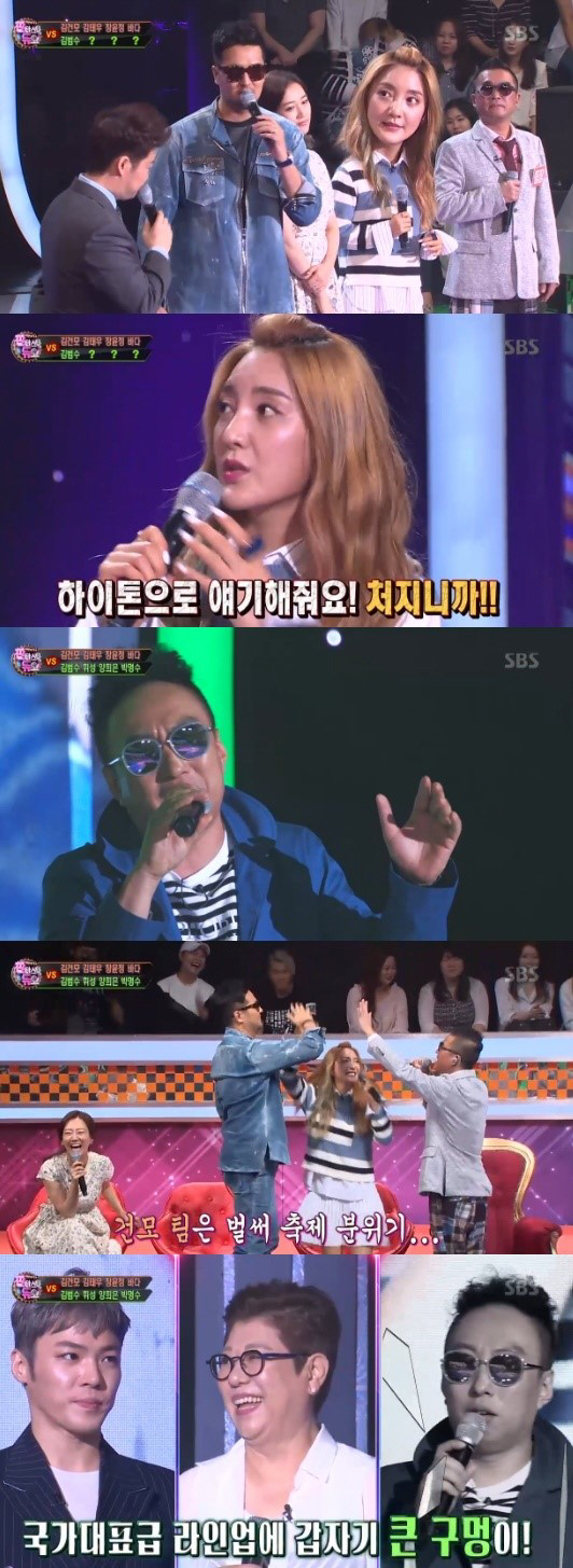 이후 김건모팀의 팀원이 공개됐다. 가장 먼저 김태우가 등장, 이어 장윤정, 바다가 등장했다. 이어 김범수 팀이 공개됐다. 휘성과 양희은에 이어 박명수가 등장했고, 박명수의 등장에 김건모 팀은 환한 미소를 짓는 등 축제 분위기를 자아내 웃음을 안겼다.