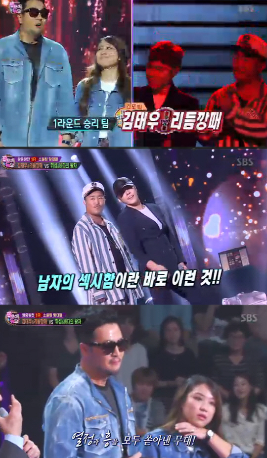 이어 김태우와 '리듬깡패'는 지오디의 'Friday Night Lights(프라이데이 나잇 라이츠)'를 선곡해 무대에 올랐다. 이들은 어깨를 들썩이게 만드는 신나는 무대를 선보였다. 이어진 '촛불하나'의 무대에서는 상대팀의 흥을 이끌어내며 환호 가득한 무대로 시선을 집중시켰다.