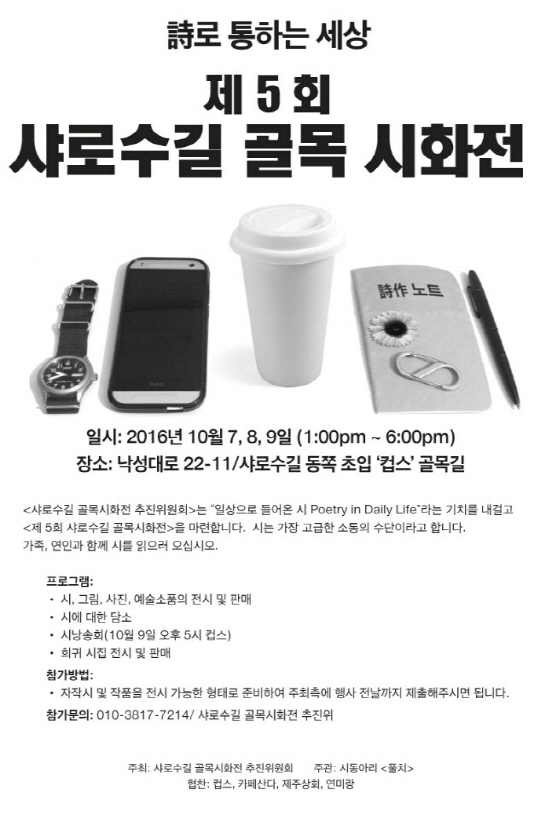 제 5회 샤로수길 골목시화전이 오는 10월 7일부터 9일까지 사흘간 서울 관악구 낙성대 샤로수길 '컵스' 골목에서 열린다.