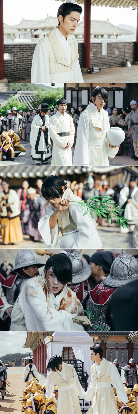 공개된 사진 속에는 4황자 왕소가 군중 속으로 나아가 기우제 의식을 지내는 모습이 담겨있어 시선을 강탈한다. 가면으로 흉터 난 얼굴을 가린 채 손에 물이 든 항아리와 나뭇가지를 들고 의식을 치르기 위해 군중 앞에 나선 4황자 왕소. 긴장한 모습이 역력한 가운데 그는 이내 몸을 움츠리고 진흙과 돌을 온 몸으로 맞으며 상처 난 얼굴로 패닉에 휩싸여 있어 보는 이들을 안타깝게 만든다.
