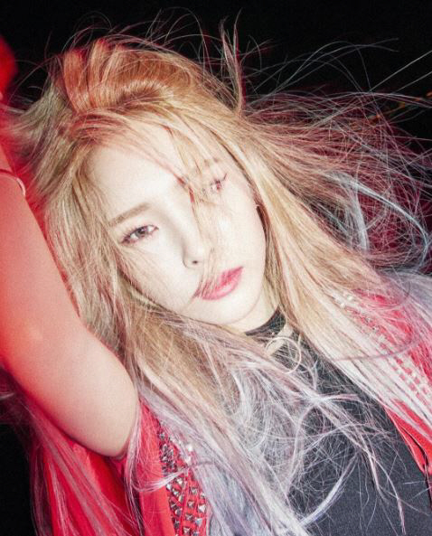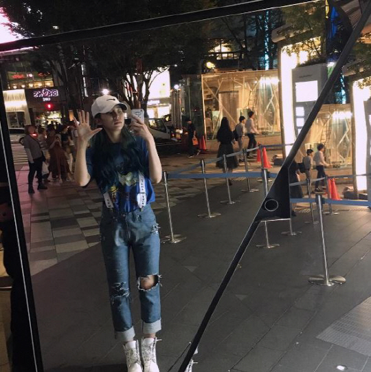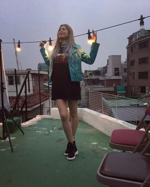 웬만한 각오 없이 소화하기 힘든 에메랄드 컬러의 아이템을 완벽하게 소화한 헤이즈. 우선적으로 헤이즈의 애쉬 퍼플 헤어컬러와 에메랄드 컬러의 라이더 자켓이 환상적인 조화를 이뤘다. 그리고 헤이즈는 루스한 블랙 컬러의 티셔츠를 매치해 자신의 숨막힐 정도로 매혹적인 각선미를 부각시켰다. 거기에 블랙과 화이트 컬러가 적절하게 들어간 하이탑을 착용해 시크한 데일리룩을 완성시켰다.