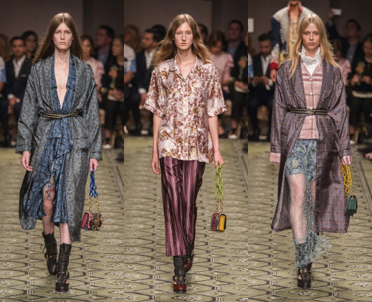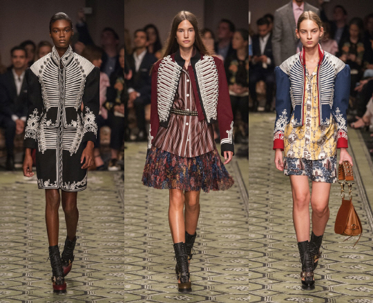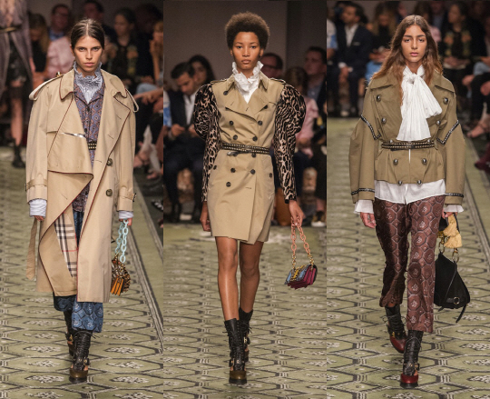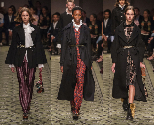 버버리는 중세시대 밀리터리 터치가 담긴 재킷 착장에서 트렌스섹슈얼의 개념을 고풍스럽고도 우아하게 담아내 찬사를 받았다. 코르셋에서 영감을 받은 페플럼 실루엣의 밀리터리 코트, 남성적인 캐벌리 코트는 루스한 파자마와의 믹스 앤 매치로 중성적인 모습을 연출했다. 장인의 공방에서 한땀 한땀 수놓아진 브레이드와 금장 단추는 럭셔리 하우스의 위엄을 보이기 충분한 요소였다.