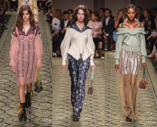 시즌 트렌드인 파자마 룩은 중세시대 귀족 인테리어를 담았다. 영국 빅토리아 앤 알버트 뮤지엄의 앤틱한 벽지 무늬에서 영감을 받은 프린트는 은은한 컬러 팔레트로 우아하게 그려졌다. 여기에 버티컬 스트라이프와 버버리 시그너처 체크같은 다양한 패턴과 믹스해 지루하지 않은 파자마 웨어를 선보였다. 버버리 쁘띠 백 역시 엘리자베스 러플 칼라를 상징하는 아코디언 디테일의 스네이프 스킨 바디에 청키한 체인 스트랩을 더해 유니크하게 탄생됐다.