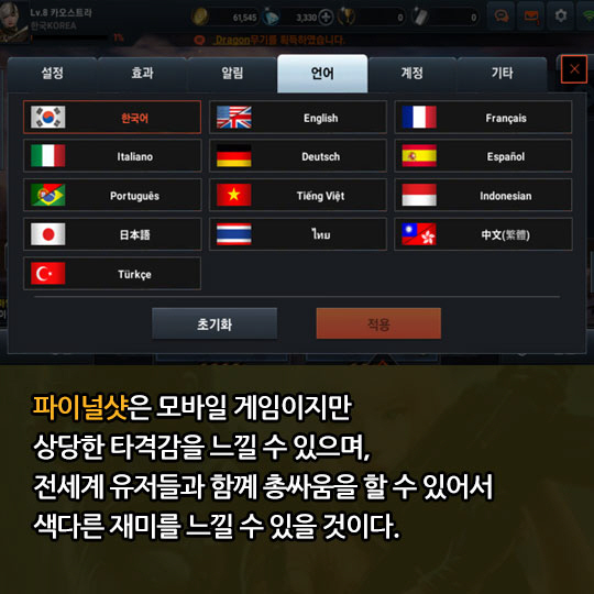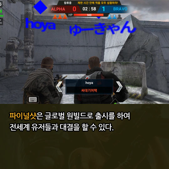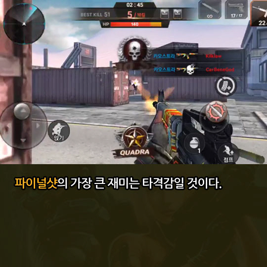 파이널샷은 모바일게임이지만 상당한 타격감을 느낄수 있으며, 전세계 유저들과 함꼐 총싸움을 할수 있어서 색다른 재미를 느낄수 있을 것이다.