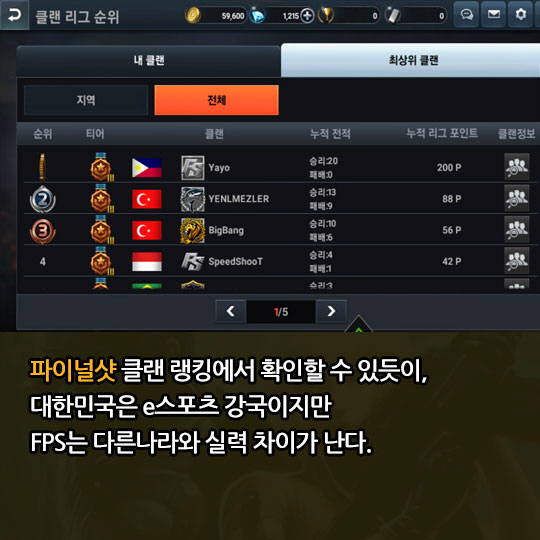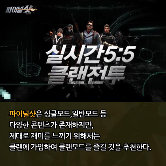 파이널샷은 싱글모드,일반모드등 다양한 콘텐츠가 존재하지만, 제대로 재미를 느끼기 위해서는 클랜에 가입하여 클랜모드를 즐길것을 추천한다.