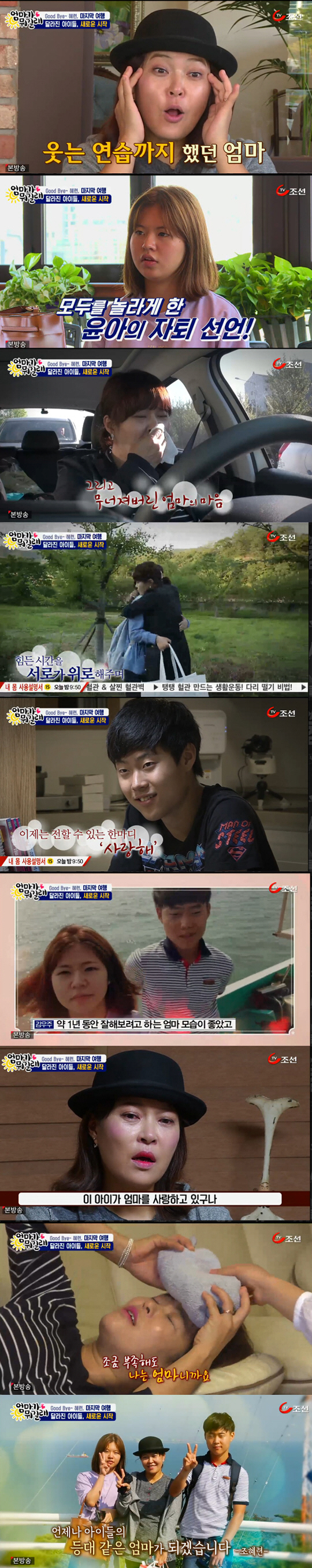 조혜련은 "우리는 준비되지 않은 상태에서 엄마가 된다. 조금 부족하지만 난 엄마"라며 "이 프로그램을 하면서, 아이들이 정말 엄마를 사랑하고 있구나라는 걸 느꼈다"며 새삼 눈물을 글썽였다.