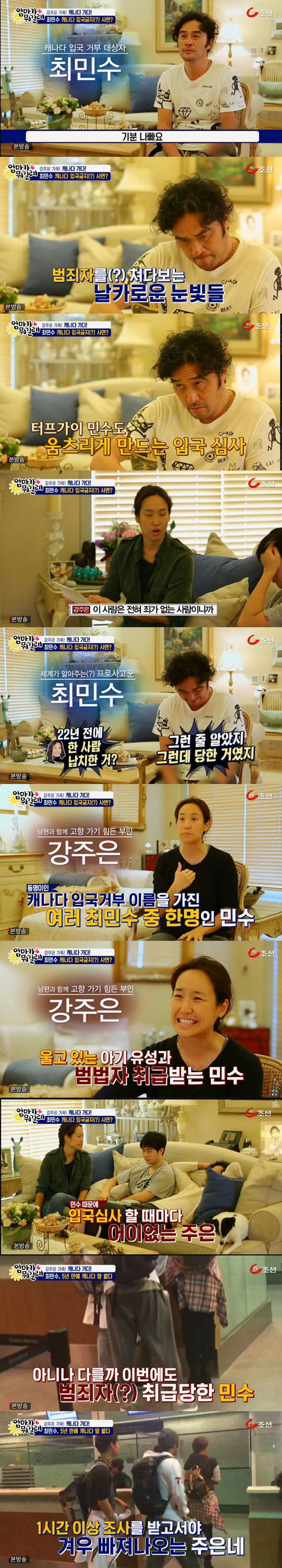 예상대로 최민수의 캐나다 입국은 까다로웠다. 최민수 가족을 마중나온 그의 장인은 "나올 슌가 됐는데…"를 되뇌이며 1시간 이상 기다려야했다.