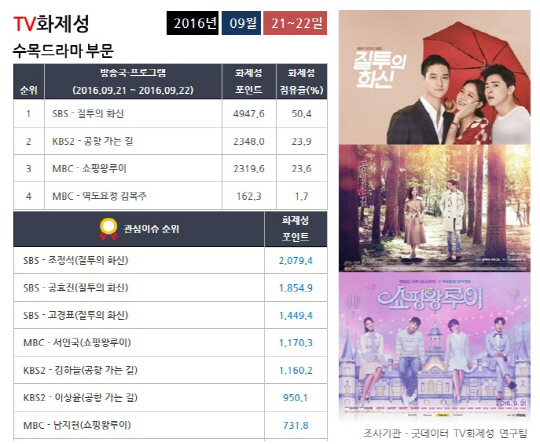 TV화제성 조사기관 굿데이터코퍼레이션에 따르면 9월21일부터 9월22일까지 방송되거나 방송예정인 수목드라마 6편의 화제성 조사한 결과 총 점유율에서 '질투의 화신'이 50.4%로 2위 '공항가는 길(23.9%)'과 3위 쇼핑왕루이(23.6%)를 합한 수치보다 높게 나타난 것이다.