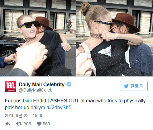 이후 지지 하디드는 자신의 트위터를 통해 "나도 사람이다. 나는 스스로를 지킬 권리가 있다"며 "오늘은 복싱 코치에게 감사한 날"이라고 적으며 분노했다.