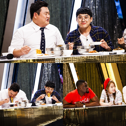 또 권혁수는 칼국수 면과 수제비를 동시에 즐길 수 있는 '얼큰칼제비' 시식에 김준현과 함께 나서 면을 끊지 않고 한 번에 먹는 일명 '면치기'에 도전했다. 두 사람은 데칼코마니처럼 똑같은 모습으로 완벽한 면치기를 선보여 특급 케미를 자랑했다.