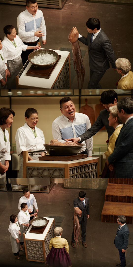 공개된 사진에서 '한식대첩4'의 심사위원 최현석은 초대형 문어를 한손으로 번쩍 들어 올리며 힘을 과시, 상남자 매력을 뽐내고 있다. MC 강호동 역시 엄청난 크기를 자랑하는 문어의 등장에 입이 떡 벌어지며 놀라움을 감추지 못했다. 제작진에 따르면 '한식대첩4'의 심사위원들과 고수들 모두 "이 정도 크기의 문어를 눈으로 직접 본 것은 처음"이라며 감탄을 연발했다는 후문이다.'한식대첩4'의 연출을 맡은 현돈PD는 "전국 10개 지역에서 모인 고수들이 각 지역의 대표로 출전한 만큼, 구하기 어렵다는 희귀 식재료들을 공수해 첫 방송부터 화려한 볼거리를 자랑할 예정이다. 각 지역의 일품 식재료가 공개될때 마다 다른 지역의 고수들과 심사위원들이 모두 모여 가까이에서 눈으로 확인할 정도로 촬영 내내 놀라움의 연속이었다. 초대형 문어 외에도, '저런 식재료가 있었어?'라는 감탄사가 절로 나오는 식재료들이 연달아 등장해 한식의 신세계를 선보일 예정이니, 첫 방송을 기대해 달라"고 전했다.