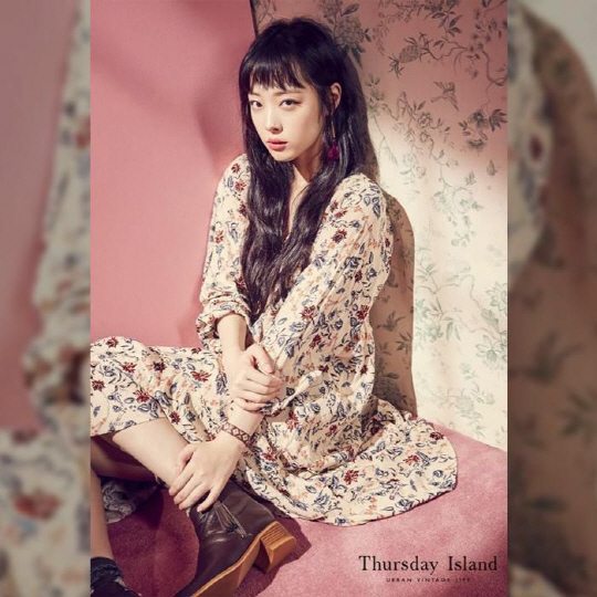 화보 속 설리는 에스닉한 무드를 한껏 뽐낼 수 있는 팔찌를 선택했네요. 천연 소가죽으로 만든 브라운 컬러의 팔찌입니다. 이국적인 패턴으로 고급스럽고 세련되게 연출할 수 있는 아이템이죠. 메탈이 아닌 가죽 소재이기에 편안하면서도 캐주얼한 느낌을 더하네요. 써스데이 아일랜드 제품.